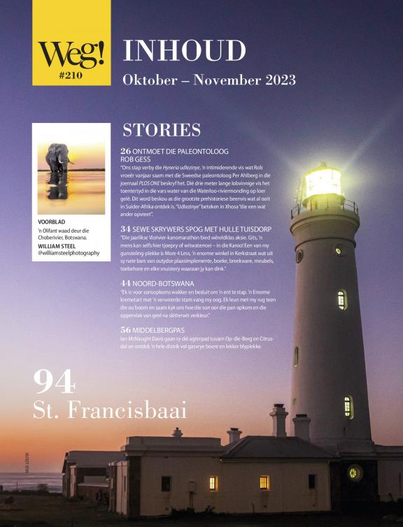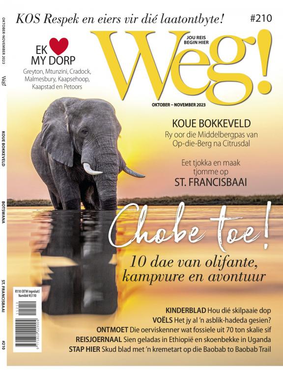 Suid-Afrika se voorste reistydskrif is enige buitelewemens se paspoort tot bekostigbare bestemmings en blyplek in Suidelike-Afrika. Elke uitgawe is volgepak met puik foto’s en gesaghebbende stories oor interessante mense en plekke (en wat om daar te doen). Kamp, voetslaan, fotografie, toerusting, kos, die langpad, en avontuur is ook deel van Weg se DNS. En omdat ons nie freebies aanvaar nie en self vir alles betaal, weet lesers hulle kan ons inligting vertrou. Of jy wil wegbreek vir die naweek of ’n lang vakansie, jou reis begin hier...