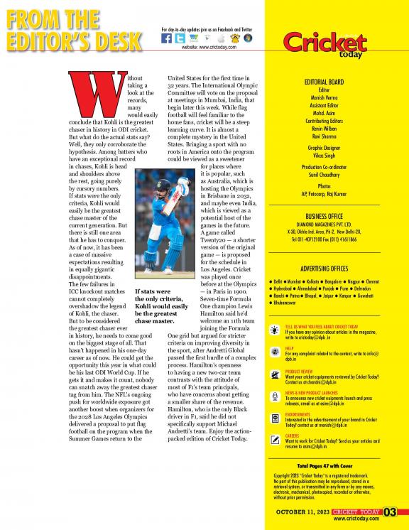 Cricket Today is a monthly cricket magazine in Hindi published by a Delhi-based company, Diamond Magazines. It is one of the most popular cricket magazines in India, and is known for its in-depth coverage of all aspects of the game, including: * Match reports and analysis: Cricket Today provides detailed match reports and analysis of all major cricket matches, including Test matches, One-Day Internationals, and T20 Internationals. The magazine also covers domestic cricket tournaments in India, such as the Ranji Trophy and the Indian Premier League. * Player profiles and interviews: Cricket Today features profiles of top cricket players from India and around the world, as well as interviews with them. These profiles and interviews provide readers with insights into the lives and careers of these players. * Expert columns and commentary: Cricket Today features columns and commentary from leading cricket experts, including former players, coaches, and journalists. These columns and commentary provide readers with different perspectives on the game. * Cricket news and trends: Cricket Today covers the latest cricket news and trends from India and around the world. The magazine also provides analysis of the latest developments in the game. Cricket Today is a valuable resource for anyone who is interested in cricket. It is a must-read for anyone who is looking to stay informed about the latest cricket news and trends, or who is looking for in-depth coverage of all aspects of the game.