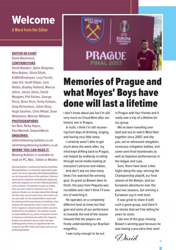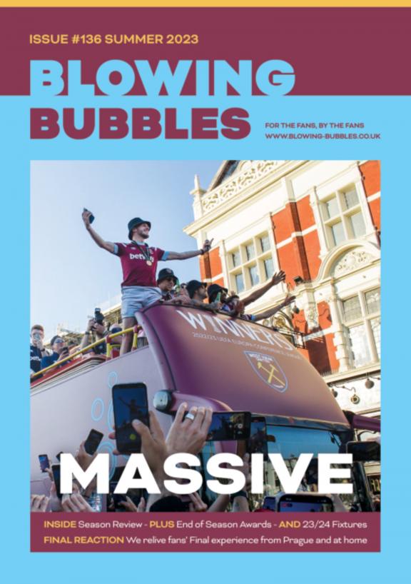 The biggest West Ham United monthly magazine, Blowing Bubbles is edited by a team of journalists and aims to inform, entertain and unite West Ham fans across the globe with our easy-to-read, well-designed & professional magazine. You can have a hard copy of every issue of Blowing Bubbles posted through your door, visit our website for details.