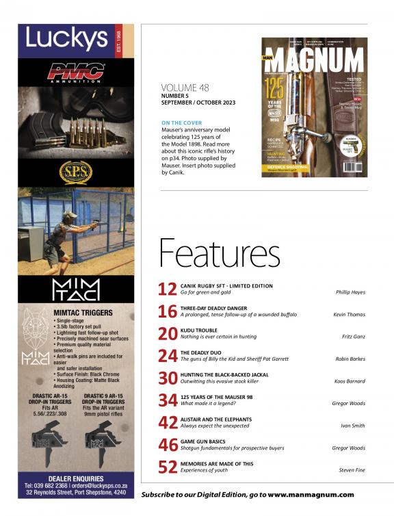 Magnum has a longstanding, worldwide reputation for its authoritative, informative and entertaining features on rifles, shotguns, handguns, black powder firearms, hunting, wing-shooting, hand-loading, African wildlife, history and adventure. Staffed by experts who “tell it as it is”. For the hunter and shooter, Magnum has it all.