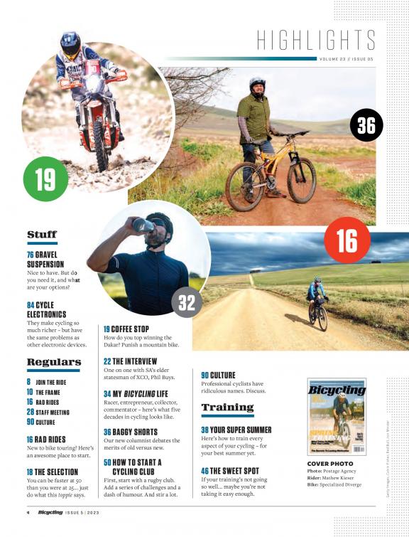 Bicycling is South Africa's leading cycling magazine and is aimed at both road and mountain biking enthusiasts. Launched in February 2003, it is published 10 times a year, targeting the fast-growing and affluent lifestyle cycling market youngsters, adults, professional as well as casual cyclists. The magazine is filled with the best international and local content for every element of the cyclist's life from training techniques and fitness information to inspiring human interest stories, event news, nutrition and motivation. Bicycling is also South Africa's leading tester of bikes and gear with over 30% of the monthly magazine dedicated to the latest reviews so our readers can make the best choices.