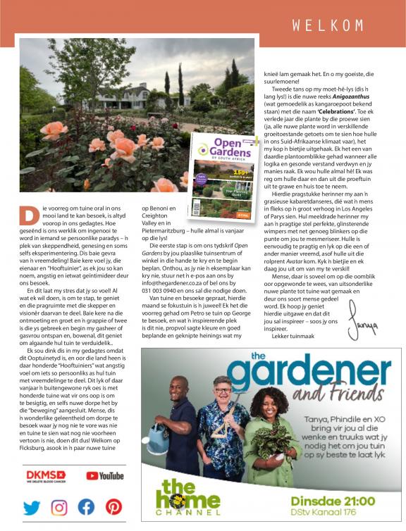 Die Tuinier Tydskrif is daaraan toegewy om tuiniers te inspireer deur praktiese raad te gee en tuinprojekte stap vir stap te wys. Ons maandartikels sluit in tuinontwerp, diepteplantartikels, die kweek van groente en kruie, watertuinmaak, tuinwildlewe en troeteldiere, spesialisplantartikels en veel meer.
