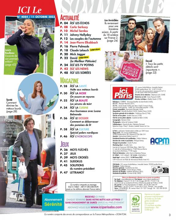 Le magazine Ici Paris vous fait partager la vie publique et privée de celles et ceux qui font l'actualité : exclusivités, interviews, enquêtes (la face cachée du showbiz, les coulisses de la télé) indiscrétions, potins.