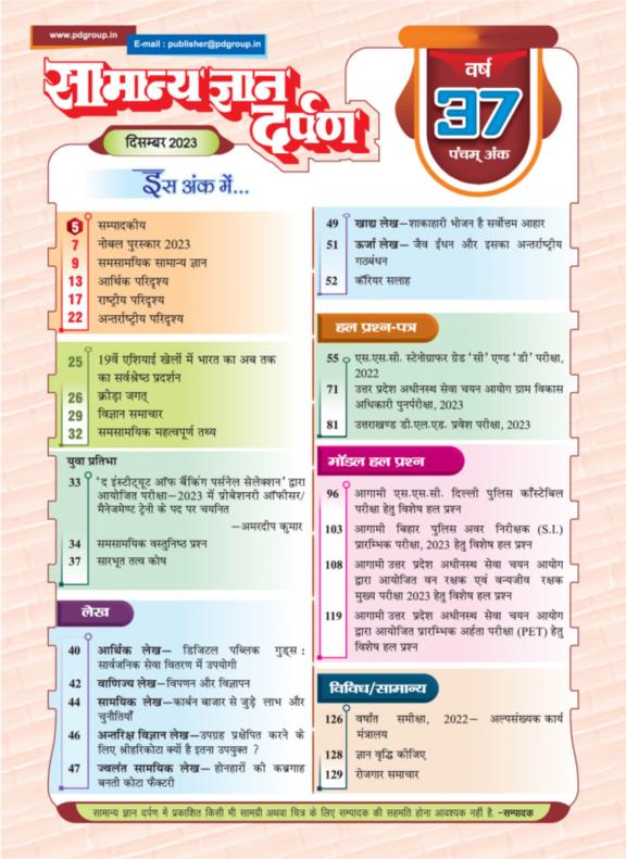 Samanya Gyan Darpan is a Hindi magazine that provides information on general knowledge, history, geography, science, and other topics. The magazine was first published in 1980 and is still one of the most popular general knowledge magazines in India. Samanya Gyan Darpan features a variety of articles each month, including: * General knowledge questions: This section asks general knowledge questions on a variety of topics. * Subject-based articles: This section publishes informative articles on a particular subject. * Special issues: This section publishes special issues on a particular topic, such as history, geography, science, or others. Samanya Gyan Darpan is a valuable resource for students, competitive exam aspirants, and the educated public in general. The magazine can help you learn about the world and increase your knowledge.