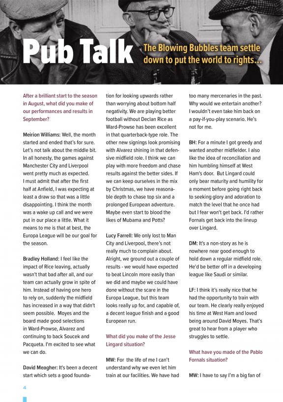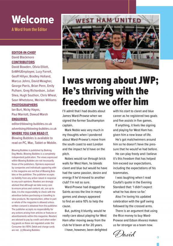 The biggest West Ham United monthly magazine, Blowing Bubbles is edited by a team of journalists and aims to inform, entertain and unite West Ham fans across the globe with our easy-to-read, well-designed & professional magazine. You can have a hard copy of every issue of Blowing Bubbles posted through your door, visit our website for details.