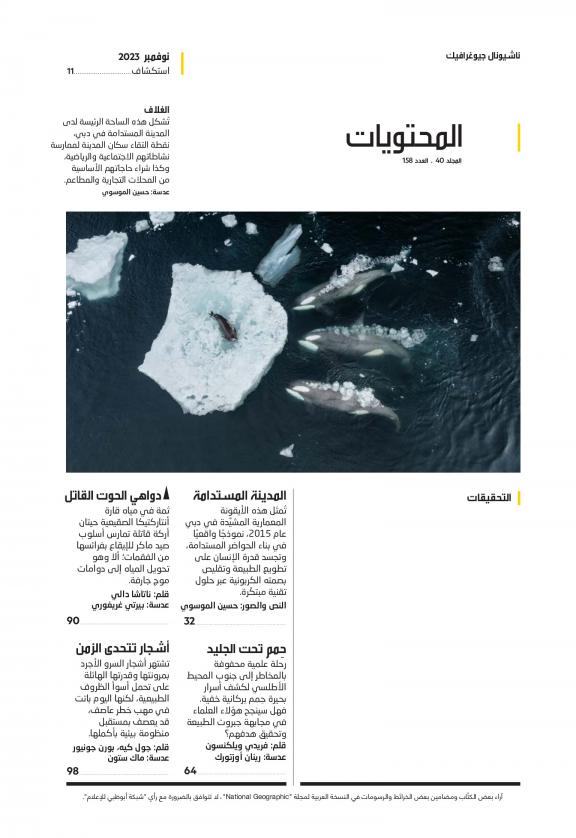 بعد النجاح المدوي لمجلة ناشيونال جيوغرافيك ماغازين، دخلت الجمعية الجغرافية الوطنية غمار الترخيص بطبع نسخ عالمية من المجلة بلغات بلدان مختلفة. ومع توالي النجاحات في هذا المنحى، أصبح عدد الطبعات العالمية يفوق الثلاثين، كلها متشحة بلون الذهب وهي تتفيأ بظلال الإطار الشهير لناشيونال جيوغرافيك. ثم آن أوان الحدث الذي ظل عشاق المعرفة عبر العالم العربي ينتظرونه مدة عقود من الزمن: ناشيونال جيوغرافيك بلغة المتنبي والجاحظ. وكانت الانطلاقة في أكتوبر 2010 من أبوظبي حيث نشأت وازدهرت كبريات المؤسسات الإعلامية على الصعيد العالمي، وفي مقدمتها “أبوظبي للإعلام” التي تصدر مجلة “ناشيونال جيوغرافيك العربية”. منذ أول عدد من المجلة، أخذ طاقمها على عاتقه انتقاء أجود الموضوعات وأكثرها رصانة من أجل تقديم أشهى الأطباق المعرفية إلى القارئ العربي المتعطش لاكتشاف ما ينطوي عليه كوكب الأرض من أسرار. ولئن كان جل المواد المنشورة في المجلة العربية عبارة عن ترجمات من ناشيونال جيوغرافيك ماغازين، فإن الموضوعات التي تتطرق إلى المنطقة العربية- بأقلام وعدسات عربية- تجد لها حيزا خاصا بين صفحات المجلة في كل عدد. وعلى خطى المجلة الأم، ما انفكت ناشيونال جيوغرافيك العربية تستقطب خيرة المستكشفين والمصورين الفوتوغرافيين العرب من أجل كشف الحجاب عن الكنوز الطبيعية التي يزخر بها الوطن العربي براً وبحرا. كما تستنير المجلة بمشكاة هيئة علمية استشارية تضم ألمع الخبراء والعلماء العرب على الصعيد العالمي. بعد أن أنارت سماء الإعلام العربي وأضافت زخما جديدا للمطبوعات العلمية النادرة بلغة الضاد، تواصل ناشيونال جيوغرافيك العربية رحلتها في دروب المعرفة من أجل تنوير القارئ العربي وتعميق معرفته بالعالم، حتى تبقى على الدوام نافذته الفريدة على عالم لم يعشه من قبل