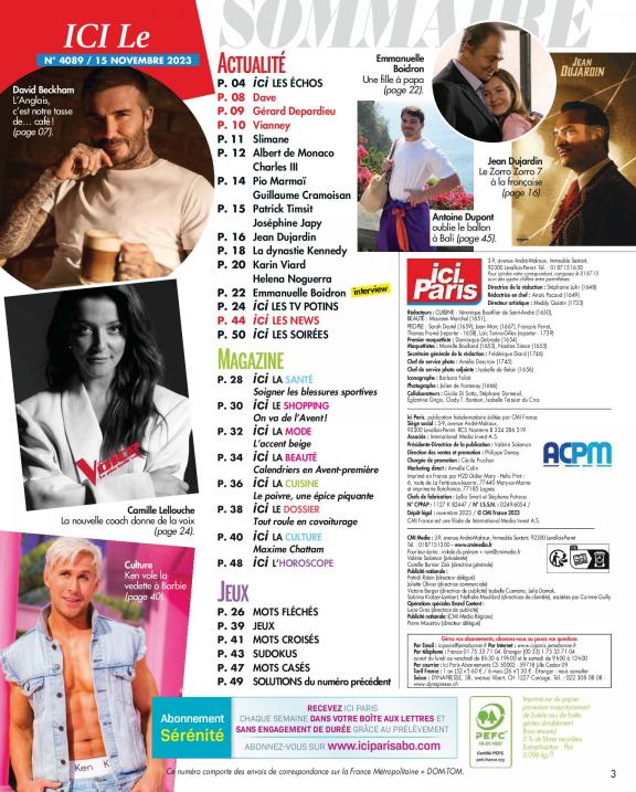 Le magazine Ici Paris vous fait partager la vie publique et privée de celles et ceux qui font l'actualité : exclusivités, interviews, enquêtes (la face cachée du showbiz, les coulisses de la télé) indiscrétions, potins.