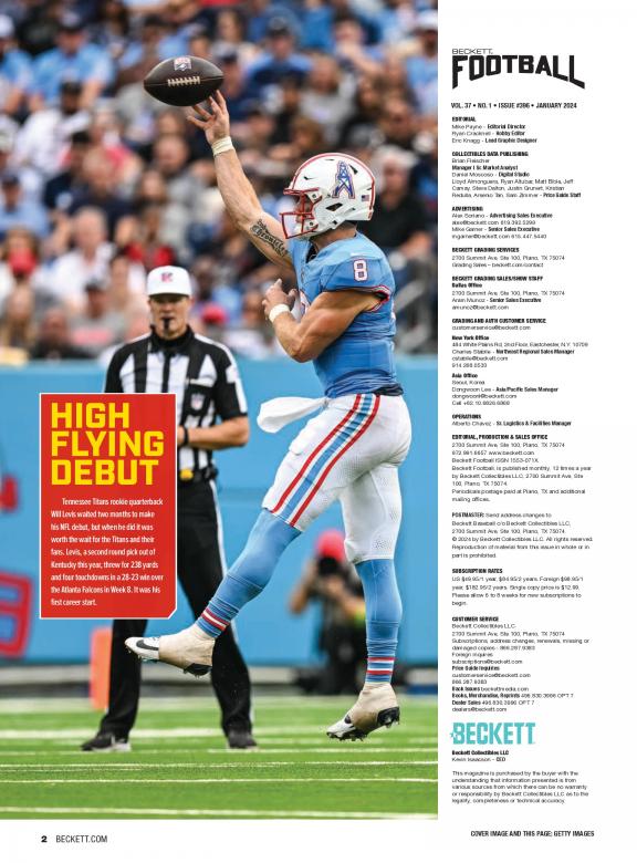 Dive into the exciting world of football collectibles and memorabilia with Beckett Football Magazine. We're thrilled to introduce you to this publication, your go-to source for all things related to football cards, collectibles, and the vibrant hobby of football memorabilia. Beckett Football Magazine, published by Beckett Collectibles LLC, is not just a magazine; it's your comprehensive guide to the world of football collectibles. As you explore the pages of Beckett Football Magazine, you'll find a world of content that caters to football collectors and fans alike: * Price Guides: Access up-to-date price guides for football cards, helping you stay informed about the value of your collectibles.