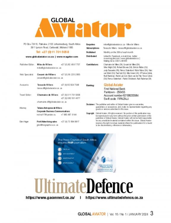 • SAA accidents from 1937 - 1987 • Changes in Store for Pilots during 2013 • Batteries can fly - dreamliners cannot • The value of a good CRM • Final data from Red Bull Stratos freefall. • USS Harry S Truman - Multifunctional taskforce in the Arabian sea • Handover of Botswana Defence Force PC-7 MkII • Nigel Hopkins - Aerobatics and Airliners do go • Denel Pilots spread their wings into Africa • The growing potential of Russian Helicopters in Latin America • Snake on a plane! • The anmanned problem • Airborne Insurance and Aircraft Finance Coporation Student of the year award • Rolls Royce Trent 1000 visited • Gulfstream G280 sets 15 new city-pair speed records as part of the reliability demonstration program And lots more!!