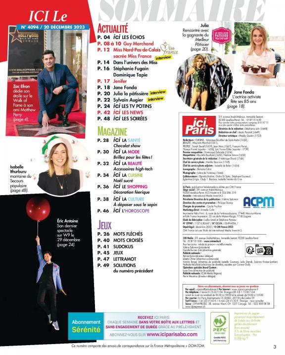 Le magazine Ici Paris vous fait partager la vie publique et privée de celles et ceux qui font l'actualité : exclusivités, interviews, enquêtes (la face cachée du showbiz, les coulisses de la télé) indiscrétions, potins.