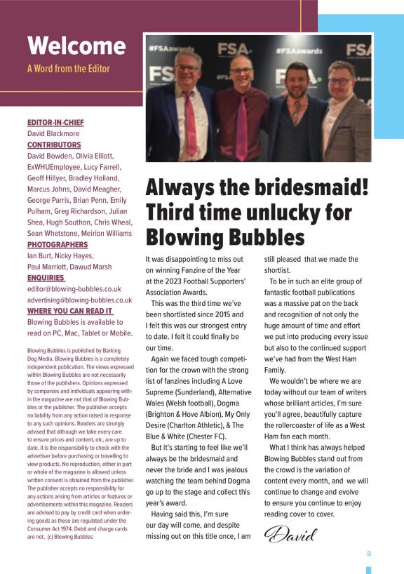 The biggest West Ham United monthly magazine, Blowing Bubbles is edited by a team of journalists and aims to inform, entertain and unite West Ham fans across the globe with our easy-to-read, well-designed & professional magazine. You can have a hard copy of every issue of Blowing Bubbles posted through your door, visit our website for details.