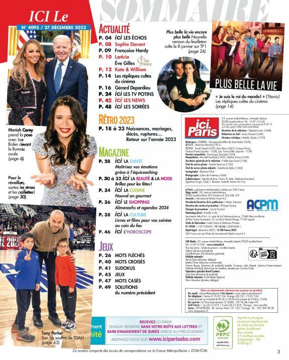 Le magazine Ici Paris vous fait partager la vie publique et privée de celles et ceux qui font l'actualité : exclusivités, interviews, enquêtes (la face cachée du showbiz, les coulisses de la télé) indiscrétions, potins.