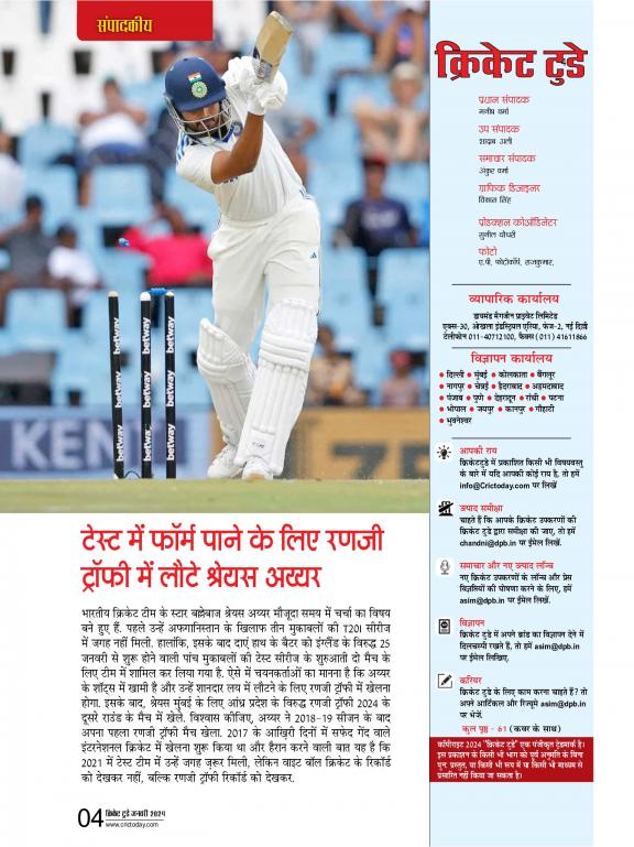 Cricket Today is a monthly cricket magazine in Hindi published by a Delhi-based company, Diamond Magazines. It is one of the most popular cricket magazines in India, and is known for its in-depth coverage of all aspects of the game, including: * Match reports and analysis: Cricket Today provides detailed match reports and analysis of all major cricket matches, including Test matches, One-Day Internationals, and T20 Internationals. The magazine also covers domestic cricket tournaments in India, such as the Ranji Trophy and the Indian Premier League. * Player profiles and interviews: Cricket Today features profiles of top cricket players from India and around the world, as well as interviews with them. These profiles and interviews provide readers with insights into the lives and careers of these players. * Expert columns and commentary: Cricket Today features columns and commentary from leading cricket experts, including former players, coaches, and journalists. These columns and commentary provide readers with different perspectives on the game. * Cricket news and trends: Cricket Today covers the latest cricket news and trends from India and around the world. The magazine also provides analysis of the latest developments in the game. Cricket Today is a valuable resource for anyone who is interested in cricket. It is a must-read for anyone who is looking to stay informed about the latest cricket news and trends, or who is looking for in-depth coverage of all aspects of the game.