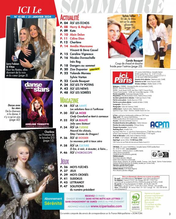 Le magazine Ici Paris vous fait partager la vie publique et privée de celles et ceux qui font l'actualité : exclusivités, interviews, enquêtes (la face cachée du showbiz, les coulisses de la télé) indiscrétions, potins.