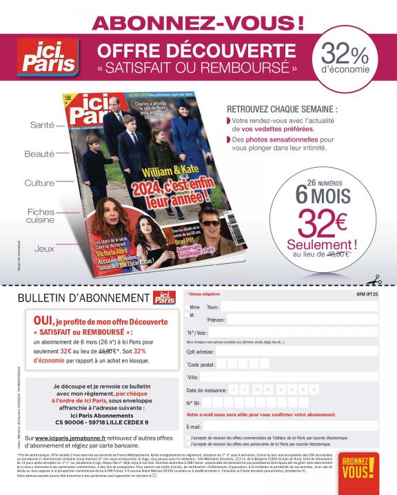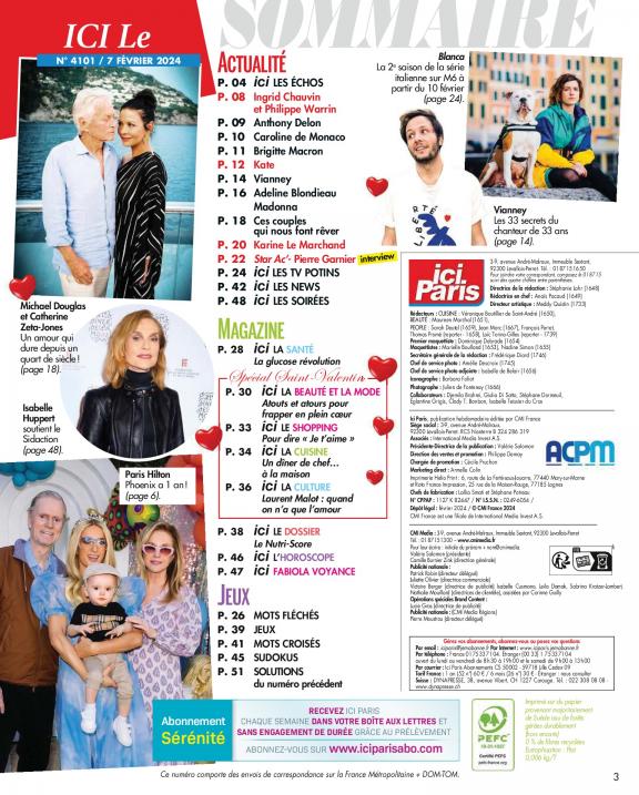Le magazine Ici Paris vous fait partager la vie publique et privée de celles et ceux qui font l'actualité : exclusivités, interviews, enquêtes (la face cachée du showbiz, les coulisses de la télé) indiscrétions, potins.