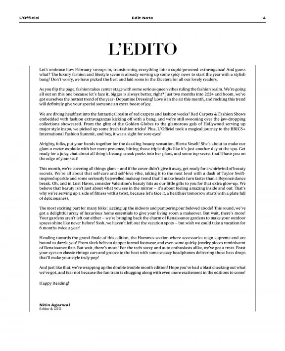 L'Officiel India is a fashion magazine published in India by TCG Media Limited. It is a part of the international L'Officiel magazine group, which has editions in over 30 countries. L'Officiel India was launched in 2006 and is published monthly. It covers fashion, beauty, lifestyle, and culture. The magazine features interviews with fashion designers, models, and celebrities, as well as editorials, features, and news. L'Officiel India is aimed at a sophisticated and discerning audience. It is known for its high-quality photography and editorial content. The magazine is a popular choice for fashion enthusiasts in India. Here are some of the features of L'Officiel India: * Fashion: L'Officiel India features the latest trends in fashion from India and around the world. It covers runway shows, designer collections, and street style. * Beauty: L'Officiel India covers the latest beauty trends and products. It features interviews with beauty experts, makeup tutorials, and skincare advice. * Lifestyle: L'Officiel India covers a variety of lifestyle topics, including travel, food, and culture. It features interviews with celebrities, travel guides, and recipes. * Culture: L'Officiel India covers the latest in art, music, and literature. It features interviews with artists, music reviews, and book excerpts. If you are interested in fashion, beauty, lifestyle, or culture, then L'Officiel India is a must-read. It is the best source of information on the latest trends and insights in these areas.