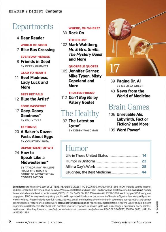 Experience the magic of Reader's Digest US and unlock a treasure trove of captivating stories, fascinating articles, and practical insights. For decades, Reader's Digest has been a trusted companion, bringing joy, inspiration, and valuable insights to millions of readers. Each issue is filled with a diverse range of content, including real-life stories of courage and resilience, health and wellness tips, practical advice, and engaging features that celebrate the beauty of life. With a Reader's Digest US subscription, you'll receive monthly deliveries of uplifting and informative content that will brighten your day and expand your horizons. From inspiring personal accounts to expertly curated content across a variety of topics, Reader's Digest is the perfect companion for those seeking both entertainment and enlightenment. Join the millions of readers who have embraced the joy of Reader's Digest US. Subscribe today and immerse yourself in a world of discovery, laughter, and meaningful connections.