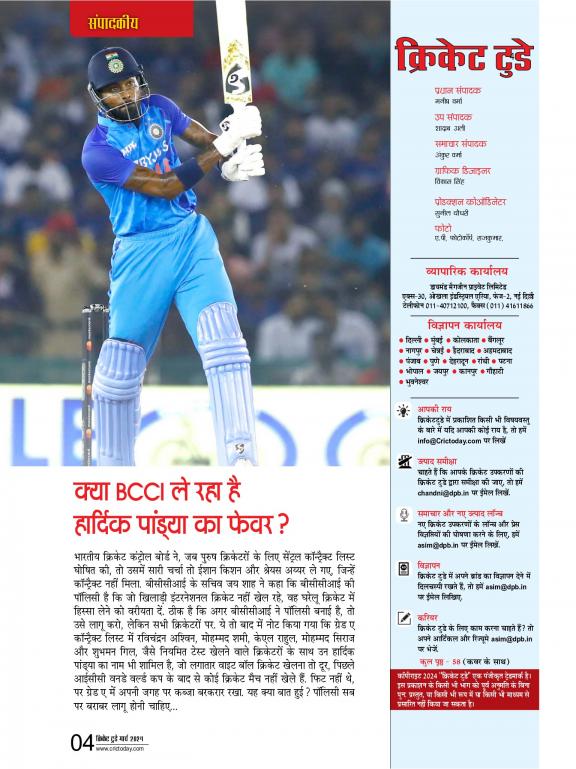 Cricket Today is a monthly cricket magazine in Hindi published by a Delhi-based company, Diamond Magazines. It is one of the most popular cricket magazines in India, and is known for its in-depth coverage of all aspects of the game, including: * Match reports and analysis: Cricket Today provides detailed match reports and analysis of all major cricket matches, including Test matches, One-Day Internationals, and T20 Internationals. The magazine also covers domestic cricket tournaments in India, such as the Ranji Trophy and the Indian Premier League. * Player profiles and interviews: Cricket Today features profiles of top cricket players from India and around the world, as well as interviews with them. These profiles and interviews provide readers with insights into the lives and careers of these players. * Expert columns and commentary: Cricket Today features columns and commentary from leading cricket experts, including former players, coaches, and journalists. These columns and commentary provide readers with different perspectives on the game. * Cricket news and trends: Cricket Today covers the latest cricket news and trends from India and around the world. The magazine also provides analysis of the latest developments in the game. Cricket Today is a valuable resource for anyone who is interested in cricket. It is a must-read for anyone who is looking to stay informed about the latest cricket news and trends, or who is looking for in-depth coverage of all aspects of the game.