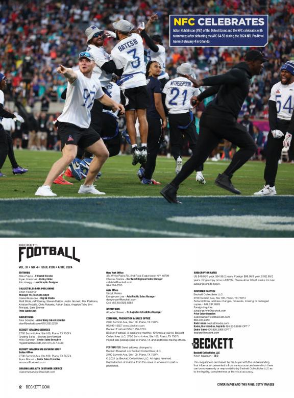 Dive into the exciting world of football collectibles and memorabilia with Beckett Football Magazine. We're thrilled to introduce you to this publication, your go-to source for all things related to football cards, collectibles, and the vibrant hobby of football memorabilia. Beckett Football Magazine, published by Beckett Collectibles LLC, is not just a magazine; it's your comprehensive guide to the world of football collectibles. As you explore the pages of Beckett Football Magazine, you'll find a world of content that caters to football collectors and fans alike: * Price Guides: Access up-to-date price guides for football cards, helping you stay informed about the value of your collectibles.