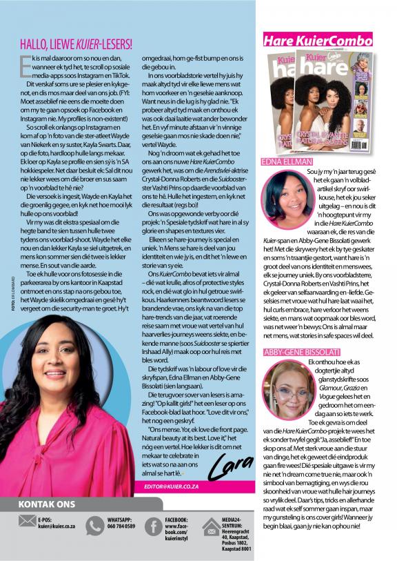 Kuier gee raad oor alles van ouerskap, geldsake, verhoudings en gesondheid tot mode, skoonheid, dekor en kos. Die tydskrif deel inspirerende stories oor mense in die gemeenskap en streef daarna om lesers op te hef en te bemagtig deur die klem te plaas op positiewe stories en suksesvolle rolmodelle. Die projekte is grootliks gemeenskapgebaseerd, met die visie om waarlik ’n verskil in lesers se lewens te maak.