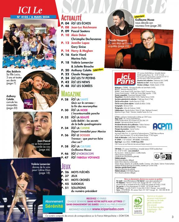 Le magazine Ici Paris vous fait partager la vie publique et privée de celles et ceux qui font l'actualité : exclusivités, interviews, enquêtes (la face cachée du showbiz, les coulisses de la télé) indiscrétions, potins.