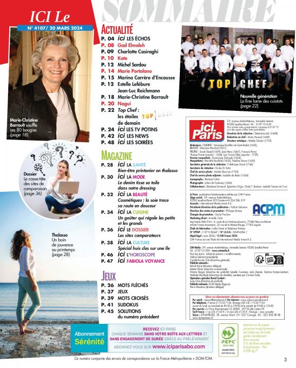 Le magazine Ici Paris vous fait partager la vie publique et privée de celles et ceux qui font l'actualité : exclusivités, interviews, enquêtes (la face cachée du showbiz, les coulisses de la télé) indiscrétions, potins.