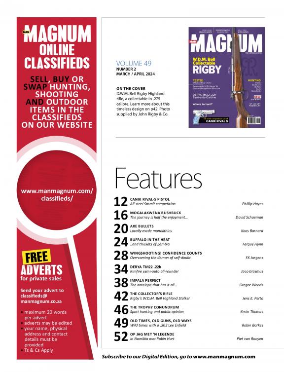 Magnum has a longstanding, worldwide reputation for its authoritative, informative and entertaining features on rifles, shotguns, handguns, black powder firearms, hunting, wing-shooting, hand-loading, African wildlife, history and adventure. Staffed by experts who “tell it as it is”. For the hunter and shooter, Magnum has it all.