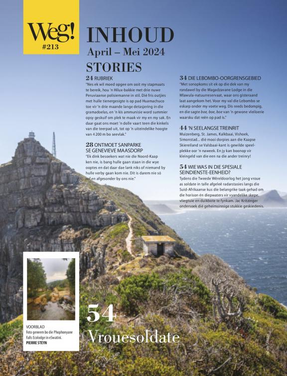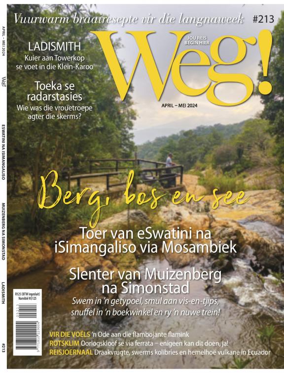 Suid-Afrika se voorste reistydskrif is enige buitelewemens se paspoort tot bekostigbare bestemmings en blyplek in Suidelike-Afrika. Elke uitgawe is volgepak met puik foto’s en gesaghebbende stories oor interessante mense en plekke (en wat om daar te doen). Kamp, voetslaan, fotografie, toerusting, kos, die langpad, en avontuur is ook deel van Weg se DNS. En omdat ons nie freebies aanvaar nie en self vir alles betaal, weet lesers hulle kan ons inligting vertrou. Of jy wil wegbreek vir die naweek of ’n lang vakansie, jou reis begin hier...