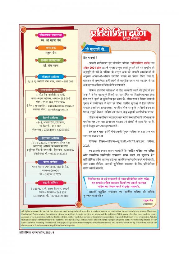 Pratiyogita Darpan Hindi Magazine is a popular Hindi-language magazine for students preparing for competitive exams in India. The magazine covers a wide range of topics, including general knowledge, history, geography, science, mathematics, and more, to help students build a strong foundation in these subjects. The magazine also includes analysis of previous years' question papers to help students understand the exam pattern and types of questions. Here are some of the features of Pratiyogita Darpan Hindi Magazine: * Comprehensive coverage: The magazine covers a wide range of topics in a comprehensive manner. * Detailed analysis: The magazine also includes analysis of previous years' question papers to help students understand the exam pattern and types of questions. * Easy to understand: The content in the magazine is presented in a simple and easy-to-understand manner. * Practice questions: The magazine also includes practice questions to help students evaluate their preparation and improve their skills. Pratiyogita Darpan Hindi Magazine is a valuable resource for students preparing for competitive exams in India. The magazine provides students with the knowledge and skills they need to succeed in these exams.