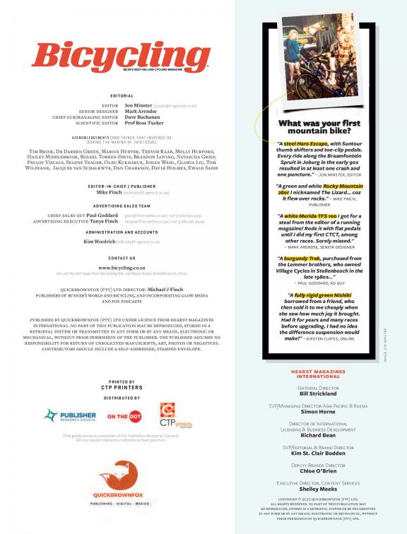 Bicycling is South Africa's leading cycling magazine and is aimed at both road and mountain biking enthusiasts. Launched in February 2003, it is published 10 times a year, targeting the fast-growing and affluent lifestyle cycling market youngsters, adults, professional as well as casual cyclists. The magazine is filled with the best international and local content for every element of the cyclist's life from training techniques and fitness information to inspiring human interest stories, event news, nutrition and motivation. Bicycling is also South Africa's leading tester of bikes and gear with over 30% of the monthly magazine dedicated to the latest reviews so our readers can make the best choices.