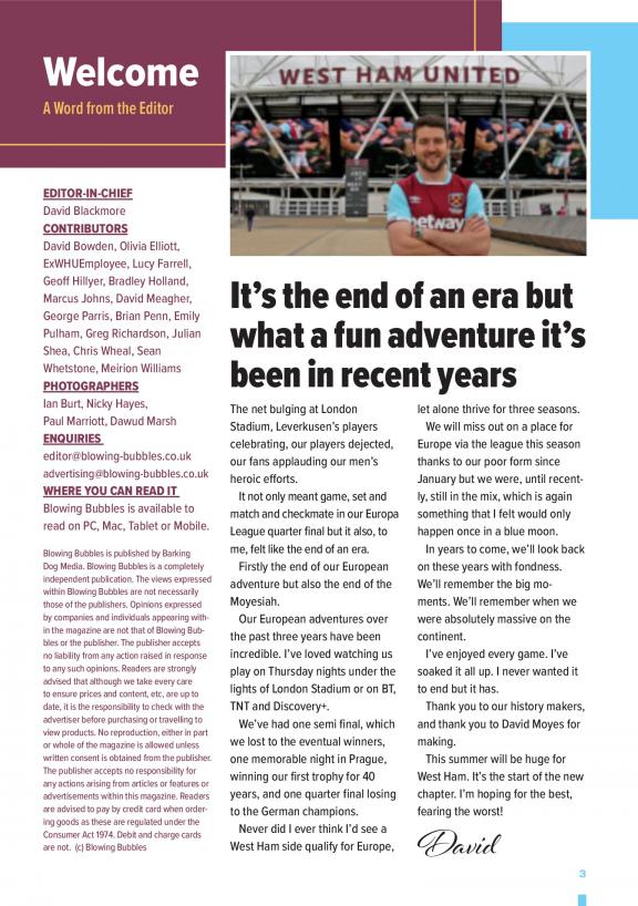 The biggest West Ham United monthly magazine, Blowing Bubbles is edited by a team of journalists and aims to inform, entertain and unite West Ham fans across the globe with our easy-to-read, well-designed & professional magazine. You can have a hard copy of every issue of Blowing Bubbles posted through your door, visit our website for details.