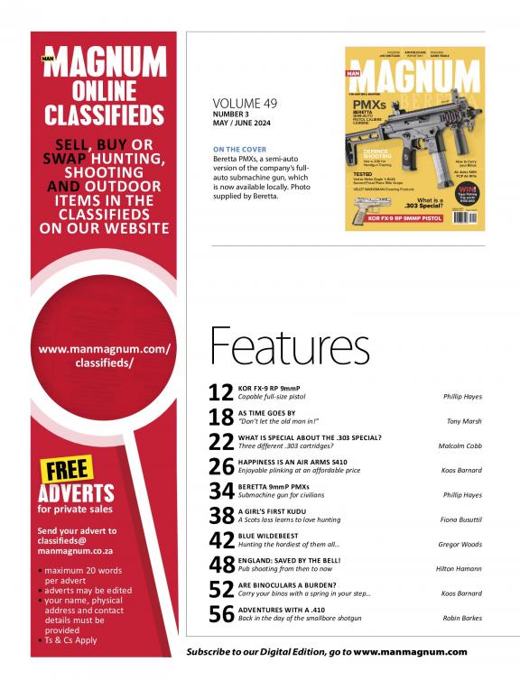 Magnum has a longstanding, worldwide reputation for its authoritative, informative and entertaining features on rifles, shotguns, handguns, black powder firearms, hunting, wing-shooting, hand-loading, African wildlife, history and adventure. Staffed by experts who “tell it as it is”. For the hunter and shooter, Magnum has it all.