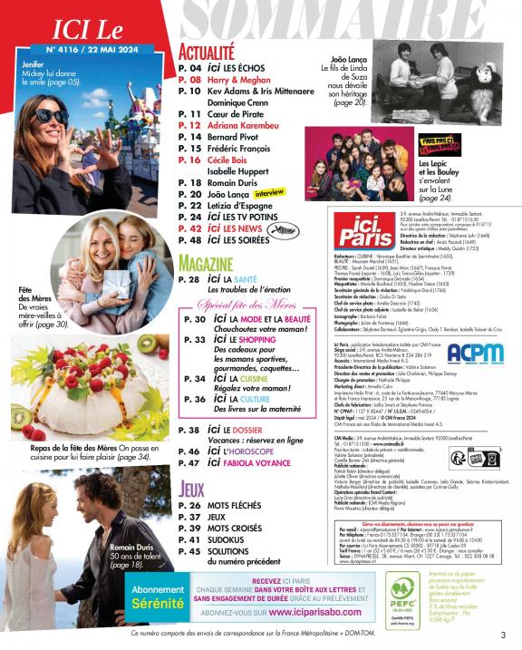 Le magazine Ici Paris vous fait partager la vie publique et privée de celles et ceux qui font l'actualité : exclusivités, interviews, enquêtes (la face cachée du showbiz, les coulisses de la télé) indiscrétions, potins.