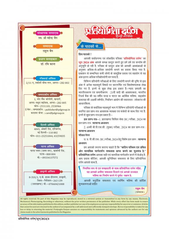 Pratiyogita Darpan Hindi Magazine is a popular Hindi-language magazine for students preparing for competitive exams in India. The magazine covers a wide range of topics, including general knowledge, history, geography, science, mathematics, and more, to help students build a strong foundation in these subjects. The magazine also includes analysis of previous years' question papers to help students understand the exam pattern and types of questions. Here are some of the features of Pratiyogita Darpan Hindi Magazine: * Comprehensive coverage: The magazine covers a wide range of topics in a comprehensive manner. * Detailed analysis: The magazine also includes analysis of previous years' question papers to help students understand the exam pattern and types of questions. * Easy to understand: The content in the magazine is presented in a simple and easy-to-understand manner. * Practice questions: The magazine also includes practice questions to help students evaluate their preparation and improve their skills. Pratiyogita Darpan Hindi Magazine is a valuable resource for students preparing for competitive exams in India. The magazine provides students with the knowledge and skills they need to succeed in these exams.