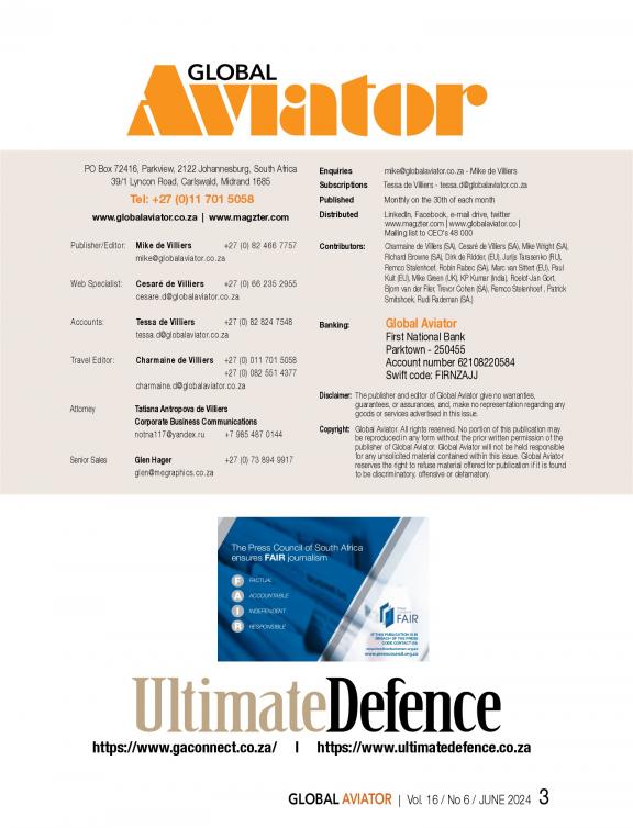 • SAA accidents from 1937 - 1987 • Changes in Store for Pilots during 2013 • Batteries can fly - dreamliners cannot • The value of a good CRM • Final data from Red Bull Stratos freefall. • USS Harry S Truman - Multifunctional taskforce in the Arabian sea • Handover of Botswana Defence Force PC-7 MkII • Nigel Hopkins - Aerobatics and Airliners do go • Denel Pilots spread their wings into Africa • The growing potential of Russian Helicopters in Latin America • Snake on a plane! • The anmanned problem • Airborne Insurance and Aircraft Finance Coporation Student of the year award • Rolls Royce Trent 1000 visited • Gulfstream G280 sets 15 new city-pair speed records as part of the reliability demonstration program And lots more!!