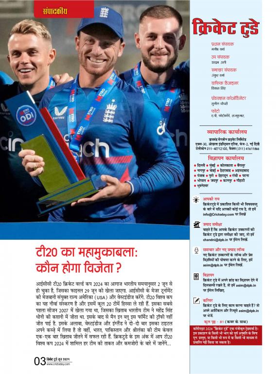 Cricket Today is a monthly cricket magazine in Hindi published by a Delhi-based company, Diamond Magazines. It is one of the most popular cricket magazines in India, and is known for its in-depth coverage of all aspects of the game, including: * Match reports and analysis: Cricket Today provides detailed match reports and analysis of all major cricket matches, including Test matches, One-Day Internationals, and T20 Internationals. The magazine also covers domestic cricket tournaments in India, such as the Ranji Trophy and the Indian Premier League. * Player profiles and interviews: Cricket Today features profiles of top cricket players from India and around the world, as well as interviews with them. These profiles and interviews provide readers with insights into the lives and careers of these players. * Expert columns and commentary: Cricket Today features columns and commentary from leading cricket experts, including former players, coaches, and journalists. These columns and commentary provide readers with different perspectives on the game. * Cricket news and trends: Cricket Today covers the latest cricket news and trends from India and around the world. The magazine also provides analysis of the latest developments in the game. Cricket Today is a valuable resource for anyone who is interested in cricket. It is a must-read for anyone who is looking to stay informed about the latest cricket news and trends, or who is looking for in-depth coverage of all aspects of the game.