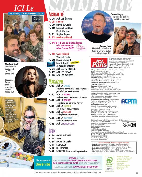 Le magazine Ici Paris vous fait partager la vie publique et privée de celles et ceux qui font l'actualité : exclusivités, interviews, enquêtes (la face cachée du showbiz, les coulisses de la télé) indiscrétions, potins.