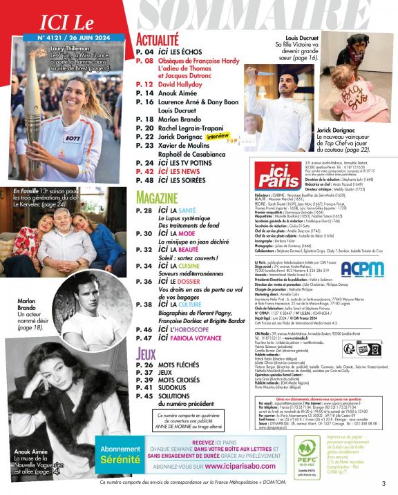 Le magazine Ici Paris vous fait partager la vie publique et privée de celles et ceux qui font l'actualité : exclusivités, interviews, enquêtes (la face cachée du showbiz, les coulisses de la télé) indiscrétions, potins.