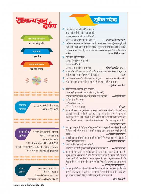 Samanya Gyan Darpan is a Hindi magazine that provides information on general knowledge, history, geography, science, and other topics. The magazine was first published in 1980 and is still one of the most popular general knowledge magazines in India. Samanya Gyan Darpan features a variety of articles each month, including: * General knowledge questions: This section asks general knowledge questions on a variety of topics. * Subject-based articles: This section publishes informative articles on a particular subject. * Special issues: This section publishes special issues on a particular topic, such as history, geography, science, or others. Samanya Gyan Darpan is a valuable resource for students, competitive exam aspirants, and the educated public in general. The magazine can help you learn about the world and increase your knowledge.