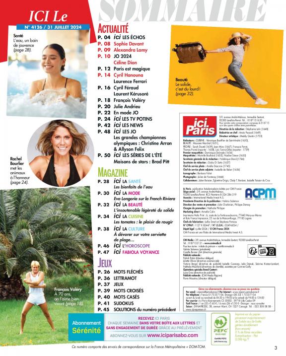 Le magazine Ici Paris vous fait partager la vie publique et privée de celles et ceux qui font l'actualité : exclusivités, interviews, enquêtes (la face cachée du showbiz, les coulisses de la télé) indiscrétions, potins.
