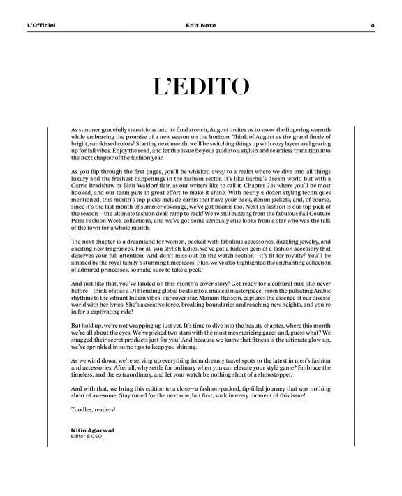 L'Officiel India is a fashion magazine published in India by TCG Media Limited. It is a part of the international L'Officiel magazine group, which has editions in over 30 countries. L'Officiel India was launched in 2006 and is published monthly. It covers fashion, beauty, lifestyle, and culture. The magazine features interviews with fashion designers, models, and celebrities, as well as editorials, features, and news. L'Officiel India is aimed at a sophisticated and discerning audience. It is known for its high-quality photography and editorial content. The magazine is a popular choice for fashion enthusiasts in India. Here are some of the features of L'Officiel India: * Fashion: L'Officiel India features the latest trends in fashion from India and around the world. It covers runway shows, designer collections, and street style. * Beauty: L'Officiel India covers the latest beauty trends and products. It features interviews with beauty experts, makeup tutorials, and skincare advice. * Lifestyle: L'Officiel India covers a variety of lifestyle topics, including travel, food, and culture. It features interviews with celebrities, travel guides, and recipes. * Culture: L'Officiel India covers the latest in art, music, and literature. It features interviews with artists, music reviews, and book excerpts. If you are interested in fashion, beauty, lifestyle, or culture, then L'Officiel India is a must-read. It is the best source of information on the latest trends and insights in these areas.