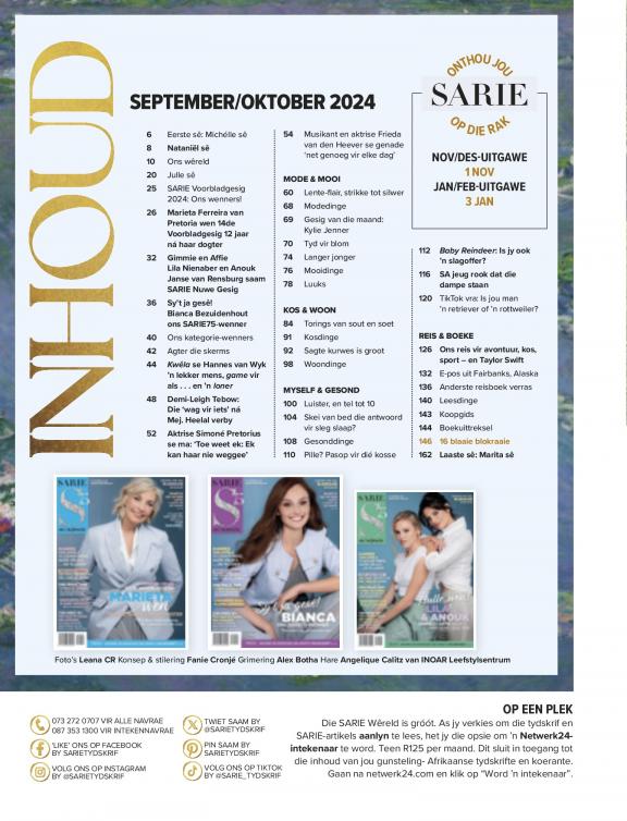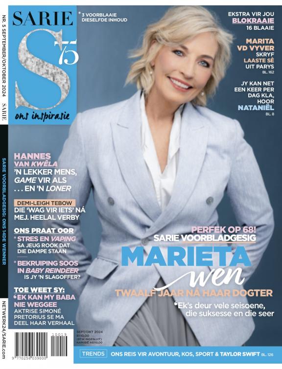 SARIE is die voorkeur-glanstydskrif van die Afrikaanssprekende vrou van Suid-Afrika met ‘n moderne wêreldbeskouiing. SARIE is ‘n intieme deel van haar lewe en ‘n ware voortsetting van haar leefstyl. Maand ná maand vertel die tydskrif tipies Suid-Afrikaanse stories wat haar altyd goed laat voel oor haarself en haar wêreld. Dis na SARIE dat sy haar wend vir kernoplossings en vertroude geselsies. Dis waar sy haar spesiale inspirasie vind.