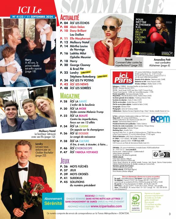 Le magazine Ici Paris vous fait partager la vie publique et privée de celles et ceux qui font l'actualité : exclusivités, interviews, enquêtes (la face cachée du showbiz, les coulisses de la télé) indiscrétions, potins.