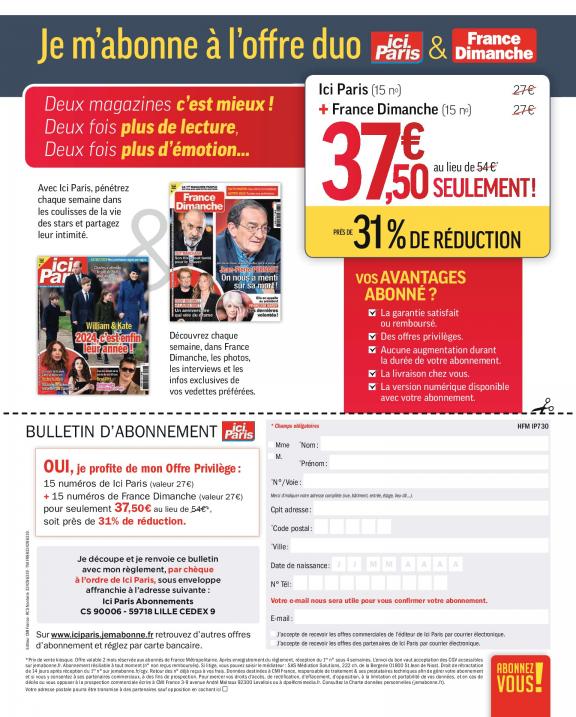 Le magazine Ici Paris vous fait partager la vie publique et privée de celles et ceux qui font l'actualité : exclusivités, interviews, enquêtes (la face cachée du showbiz, les coulisses de la télé) indiscrétions, potins.