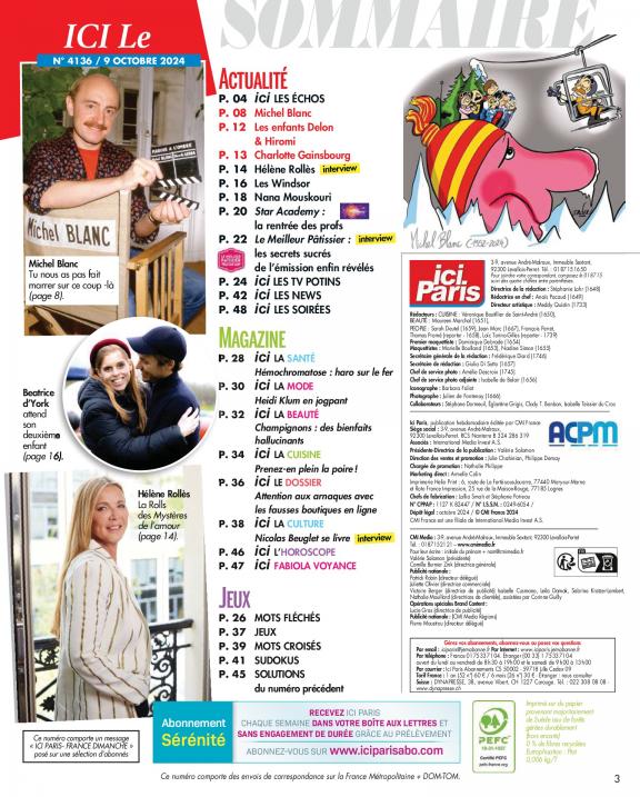 Le magazine Ici Paris vous fait partager la vie publique et privée de celles et ceux qui font l'actualité : exclusivités, interviews, enquêtes (la face cachée du showbiz, les coulisses de la télé) indiscrétions, potins.