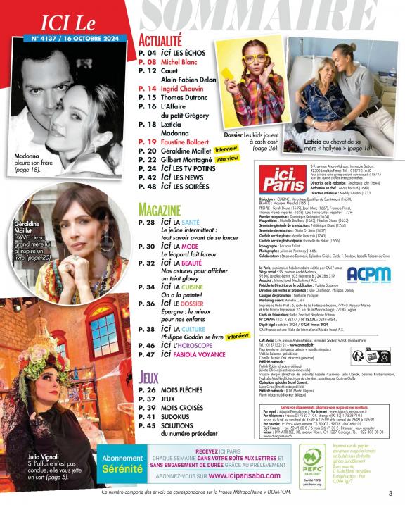 Le magazine Ici Paris vous fait partager la vie publique et privée de celles et ceux qui font l'actualité : exclusivités, interviews, enquêtes (la face cachée du showbiz, les coulisses de la télé) indiscrétions, potins.