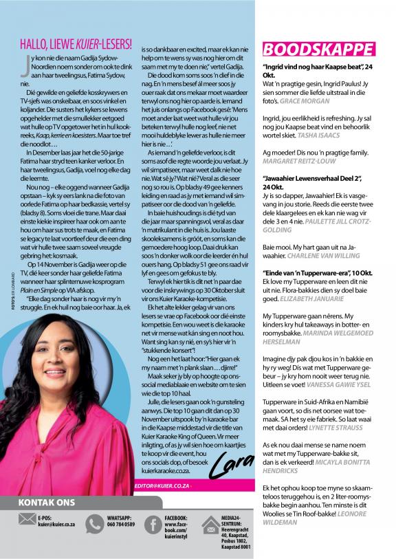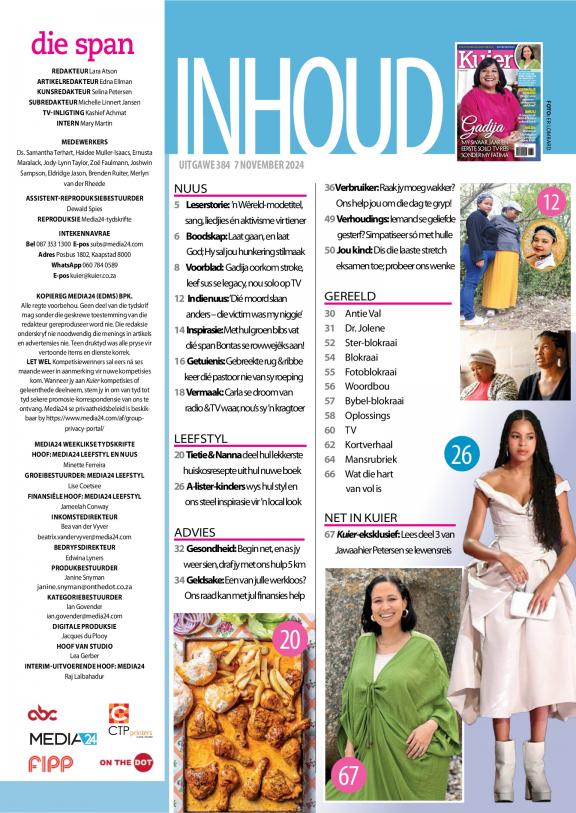 Kuier gee raad oor alles van ouerskap, geldsake, verhoudings en gesondheid tot mode, skoonheid, dekor en kos. Die tydskrif deel inspirerende stories oor mense in die gemeenskap en streef daarna om lesers op te hef en te bemagtig deur die klem te plaas op positiewe stories en suksesvolle rolmodelle. Die projekte is grootliks gemeenskapgebaseerd, met die visie om waarlik ’n verskil in lesers se lewens te maak.