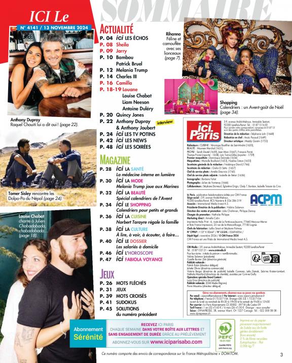 Le magazine Ici Paris vous fait partager la vie publique et privée de celles et ceux qui font l'actualité : exclusivités, interviews, enquêtes (la face cachée du showbiz, les coulisses de la télé) indiscrétions, potins.