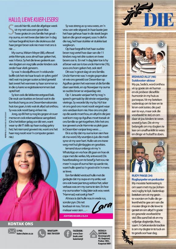 Kuier gee raad oor alles van ouerskap, geldsake, verhoudings en gesondheid tot mode, skoonheid, dekor en kos. Die tydskrif deel inspirerende stories oor mense in die gemeenskap en streef daarna om lesers op te hef en te bemagtig deur die klem te plaas op positiewe stories en suksesvolle rolmodelle. Die projekte is grootliks gemeenskapgebaseerd, met die visie om waarlik ’n verskil in lesers se lewens te maak.