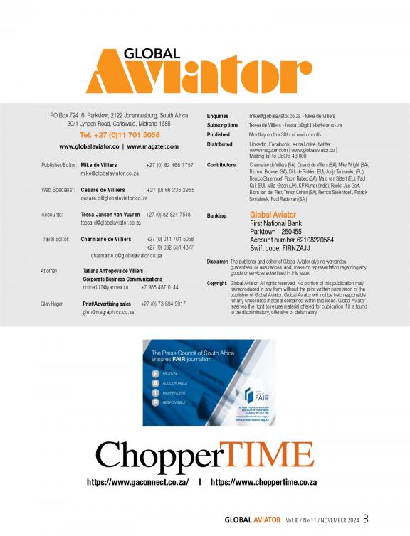 • SAA accidents from 1937 - 1987 • Changes in Store for Pilots during 2013 • Batteries can fly - dreamliners cannot • The value of a good CRM • Final data from Red Bull Stratos freefall. • USS Harry S Truman - Multifunctional taskforce in the Arabian sea • Handover of Botswana Defence Force PC-7 MkII • Nigel Hopkins - Aerobatics and Airliners do go • Denel Pilots spread their wings into Africa • The growing potential of Russian Helicopters in Latin America • Snake on a plane! • The anmanned problem • Airborne Insurance and Aircraft Finance Coporation Student of the year award • Rolls Royce Trent 1000 visited • Gulfstream G280 sets 15 new city-pair speed records as part of the reliability demonstration program And lots more!!